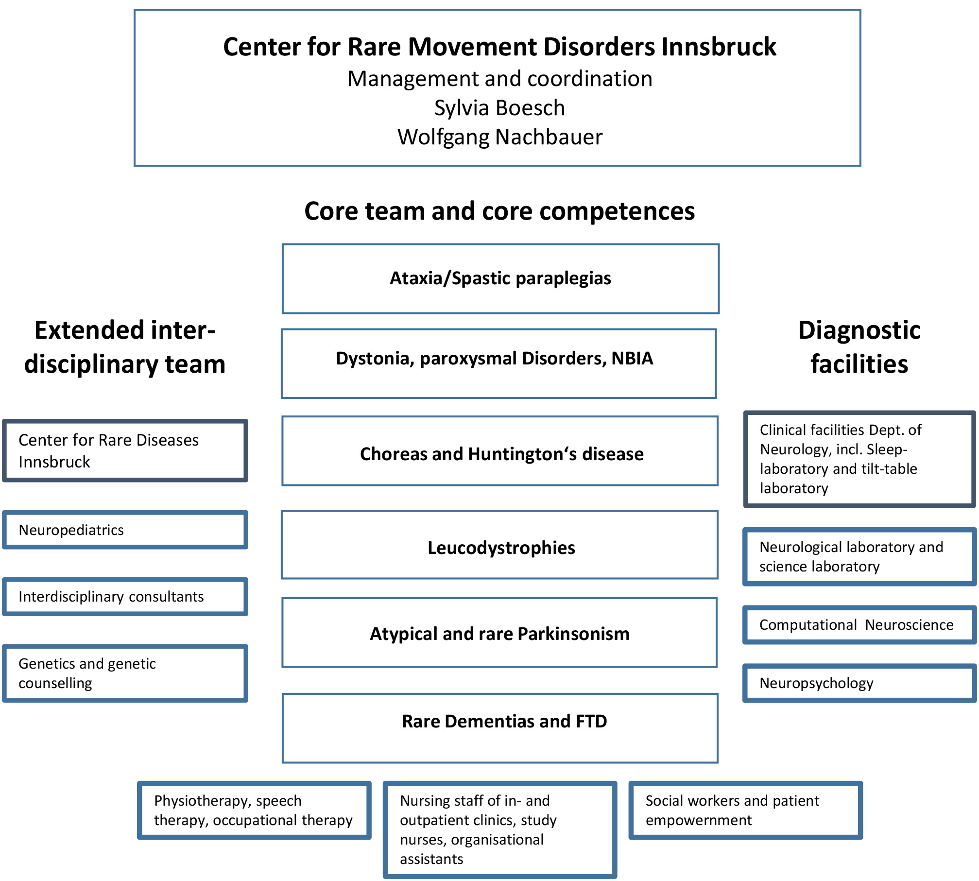 At the center of the organization of the Centre for Rare Movement Disorders are core competencies backed by experts from the core team. The core team is flanked by existing on-site facilities that round out the diagnostic and therapeutic expertise at both the clinical and scientific levels. The cluster of experts, referred to as the „extended“ interdisciplinary team, names important partners in the assignment of movement disorders, e.g. with non-neurological additional symptoms or genetic background. It also maps existing interdisciplinary forums at the site as well as the professional overlap in congenital or childhood movement disorders. The core competences are rounded off by organizational, nursing and physiotherapy teams, as well as social workers, all of whom are exclusively assigned to the Department of Neurology.