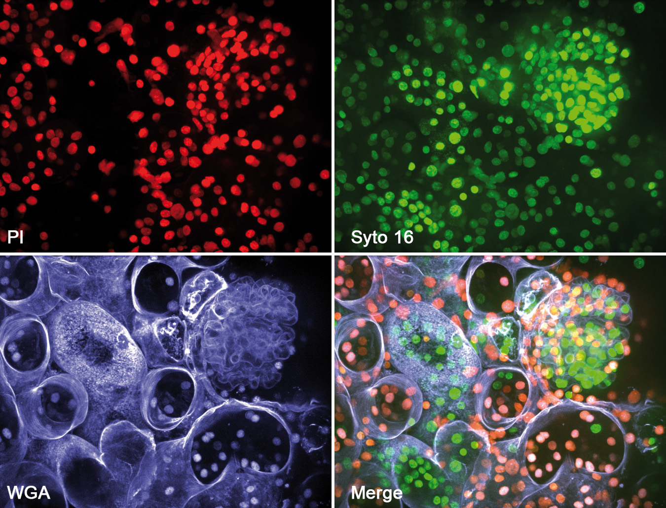 Liver biopsies are incubated with specific dyes and analyzed with a confocal microscope. The damaged cells are stained red (Pi), while the viable cells are displayed in green (syto16). Wheat germ agglutinin (Wga, blue) is used to depict the cell integrity. The images are merged to obtain a consolidated picture.