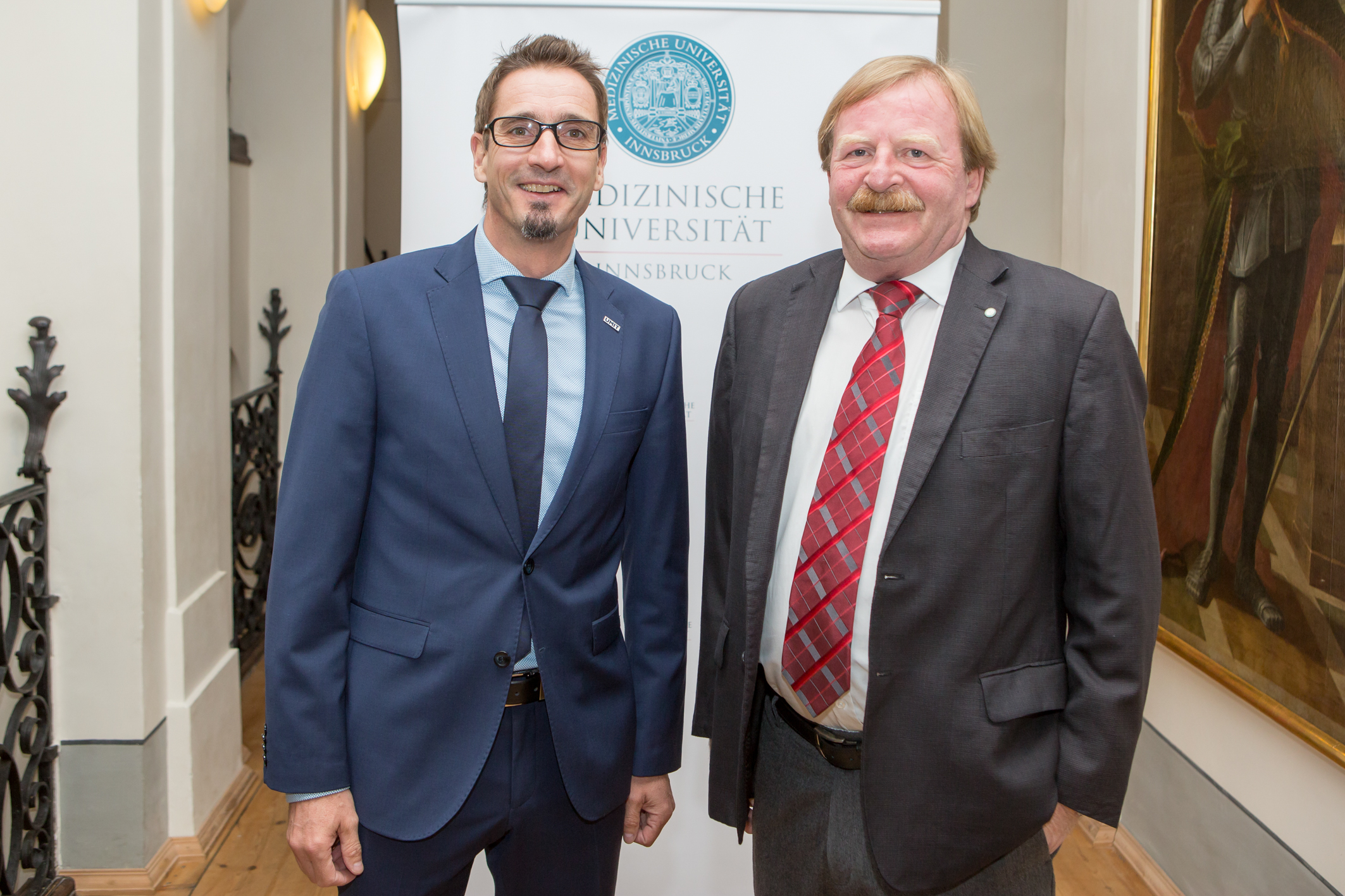 Die anschließende Zeremonie setzte auf Traditionelles und Neues – für Rektor Fleischhacker und sein Team kein Widerspruch. Das Szepter erhielt Wolfgang Fleischhacker daher von zwei MittelbauprofessorInnen, Martin Tiefenthaler als Vertreter aus dem klinischen Bereich und Alexandra Lusser als Vertreterin der theoretischen Fächer. „Die Position des Rektors unserer Universität ist ein gesellschaftlich herausragendes Amt zum Zwecke der Wahrung spitzenmedizinischer Leistungen für die Bevölkerung des Landes Tirol und der angrenzenden Länder. Die Leistungen unserer Universität nehmen konkrete Gestalt an in Form des medizinischen Angebots unserer Universitätskliniken, der Kenntnisse unserer als ÄrztInnen tätigen Absolventinnen und Absolventen sowie unserer Expertise in der Forschung und in der Lehre“, erklärte der Senatsvorsitzende Gert Mayer bei der Überreichung. Die von Ferdinand I im Jahr 1833 gestiftete Amtskette wurde Rektor Fleischhacker von den beiden VertreterInnen der ÖH-Medizin, Christine Schmidt und Herbert Seiringer, umgelegt, die, so ÖH-Medizin-Vorsitzender Philipp Kindl, als „Symbol für die Verbundenheit mit der studierenden Jugend“ zu sehen sei.