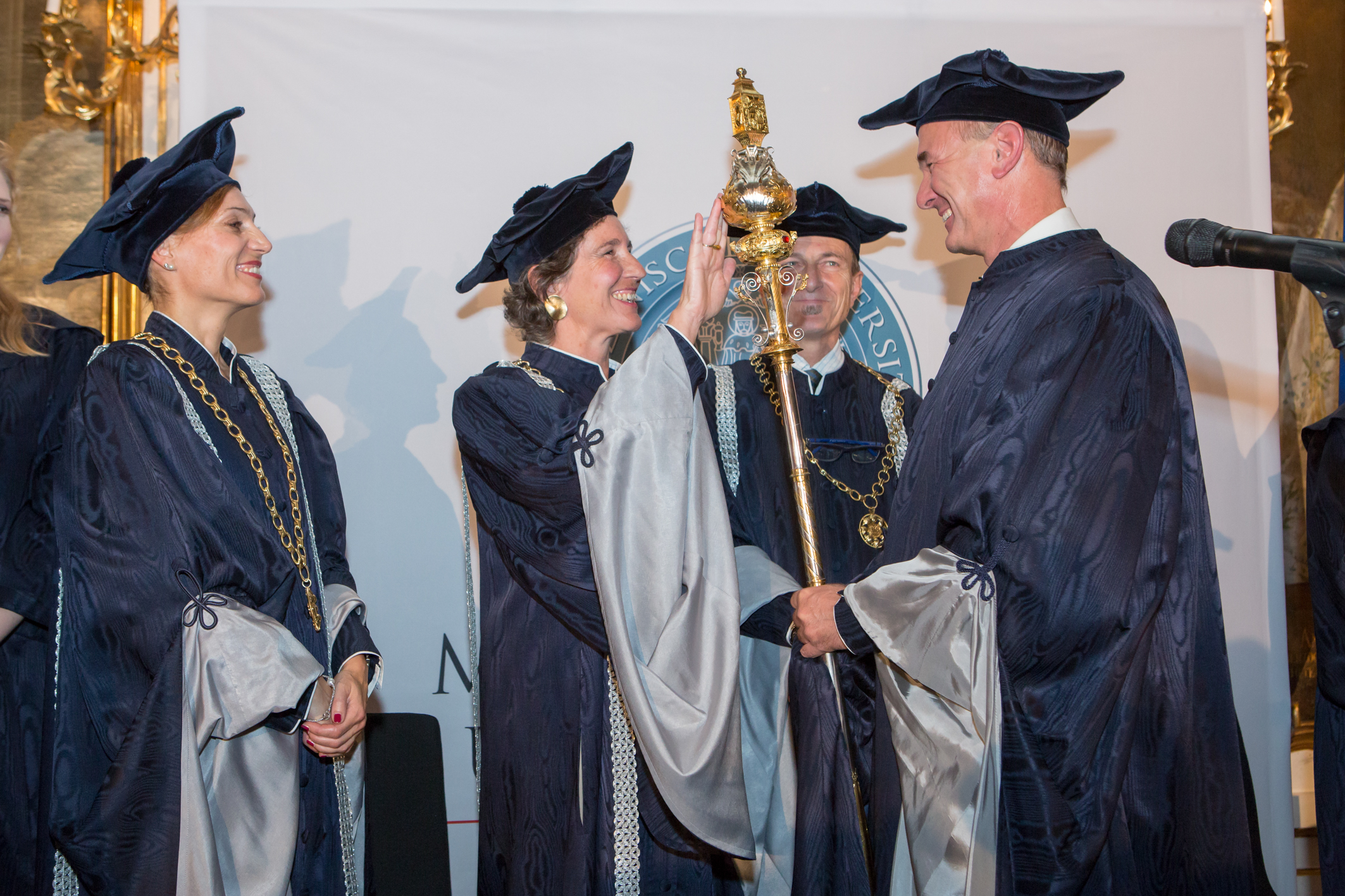 Auf die Verbindung von Vergangenem mit neuen Aspekten ging Rektor Fleischhacker dann auch in seiner Ansprache unter dem Motto „Veränderungen“ ein: „Wir haben mit einer Tradition gebrochen, paradoxerweise über eine Rückkehr zum Traditionellen. Das spiegelt wohl in gewisser Weise auch die Herausforderungen der Universitätslandschaft wider. Die Ausrichtung muss nach vorne gerichtet sein, aber immer unter Einbeziehung des Vergangenen“, sagte Rektor Fleischhacker. „Auch mein Team im Rektorat entspricht dieser Philosophie: Christine Bandtlow und Peter Loidl als die Erfahrenen und mit den Geschicken unserer Universität gut Vertrauten - und Manuela Groß und ich als die Neuen.“ Christine Bandtlow wurde in dem Festakt erneut zur Vizerektorin für Forschung und Internationales und Peter Loidl zum Vizerektor für Lehre und Studienangelegenheiten angelobt. Die gebürtige Grazerin Manuela Groß betrat mit ihrer Amtseinführung als Vizerektorin für Finanzen und IT Neuland.