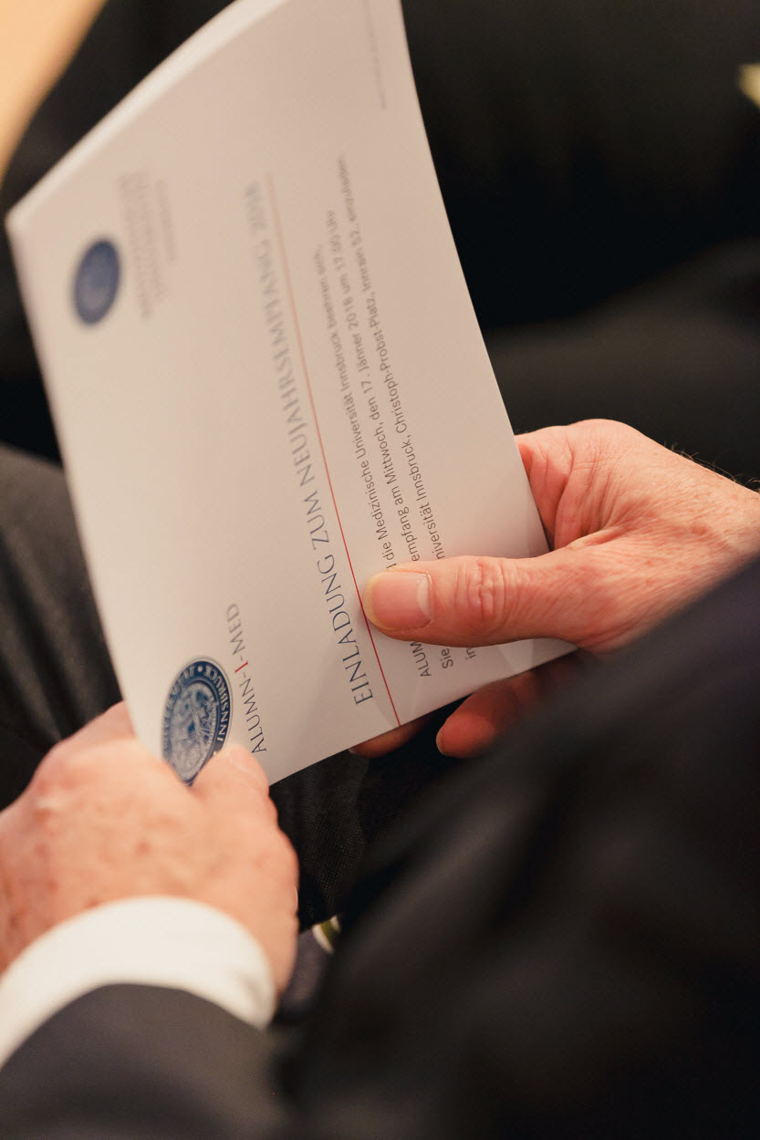 Für Wolfgang Fleischhacker war es der erste Neujahrsempfang als Rektor der Medizinischen Universität Innsbruck. Seit 1. Oktober 2017 leitet Fleischhacker die Medizinische Universität Innsbruck gemeinsam mit seinem Rektoratsteam. In seiner kurzen Rede betonte Rektor Fleischhacker, wie wichtig kollegiale Zusammenkünfte sind. „Das große Interesse am diesjährigen Neujahrsempfang zeigt auch die Aufbruchstimmung an der Medizinischen Universität Innsbruck“, erklärte Fleischhacker. „Mein Ziel ist es, Talente und Schwerpunkte zu fördern und unterstützende Strukturen zu stärken. Daran arbeiten wir im Rektoratsteam.“ Zusammen mit Rektor Fleischhacker führte Christoph Brezinka durch das Programm, der ehemalige ALUMN-I-MED Vizepräsident war im Sommer 2017 zum Vorsitzenden der AbsolventInnenorganisation der Medizinischen Universität Innsbruck gewählt worden.