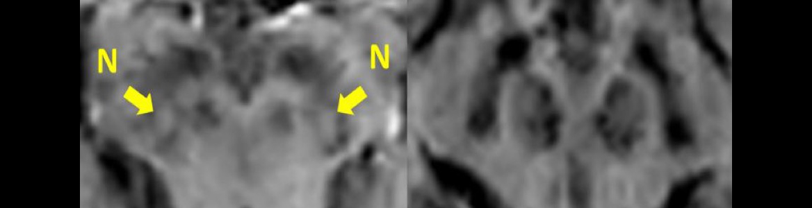 Bild: Bei Parkinson-Betroffenen führt das Absterben von Neuronen im Nigrosom 1 in der Substantia nigra dazu, dass die bei gesunden Menschen bestehende von signalarmen dunkleren Arealen umgebene signalreiche hellere längliche Struktur (N, entspricht dem sogenannten Nigrosom 1) in der eisengewichteten MRI Bildgebung (sogenannte Suszeptibilitätsgewichtete Bildgebung) fehlt.