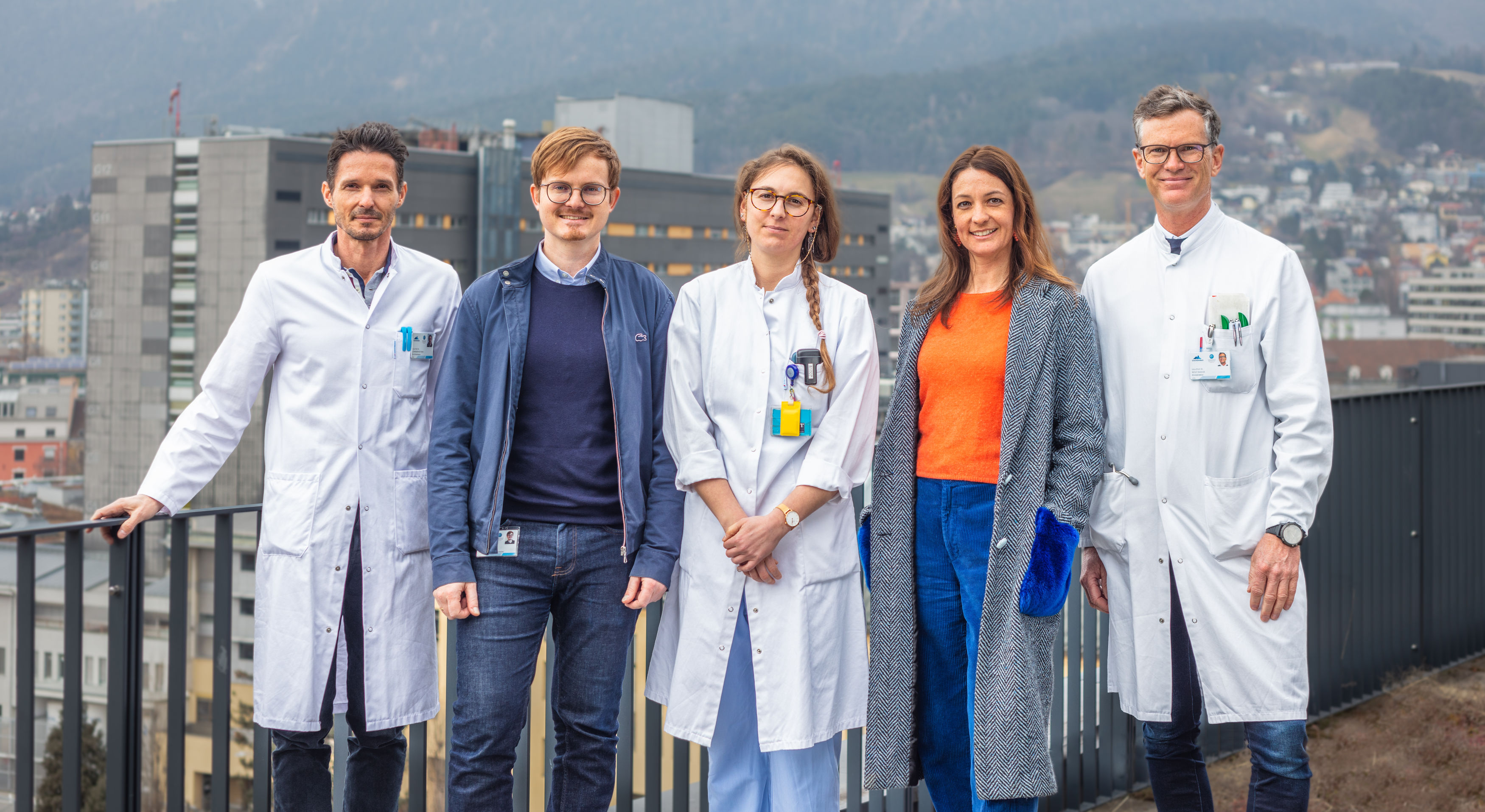 BU: Die Klinikdirektoren Stefan Schneeberger (li.) und Dominik Wolf (re.) mit den ErstautorInnen Stefan Salcher, Margot Fodor und Theresa Hautz (v.l.), © C. Simon