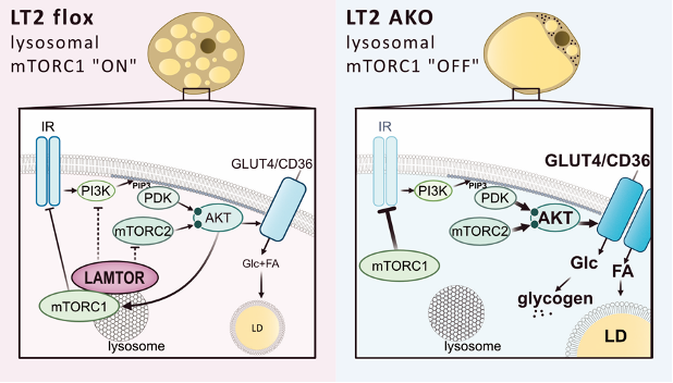 Rechts: Ein Mangel des LAMTOR-Komplexes (LT2 AKO = "aus") führt zu einer erhöhten Phosphorylierung von AKT (Protein Kinase B), was wiederum die Häufigkeit von GLUT4 (Glukose Transporter 4) und CD36 (Fatty Acid Transporter) an der Zelloberfläche erhöht und somit den Einstrom von Glukose und Fettsäuren in die Zelle fördert. Die Glukose wird hauptsächlich als Glykogen gespeichert, da die Neubildung von Fettsäuren nicht angeregt wird. Trotzdem ist der mTORC1-Komplex (mechanistic target of rapamycin complex 1) in der Lage, IRS-1 (Insulin Receptor Substrate 1) zu hemmen.