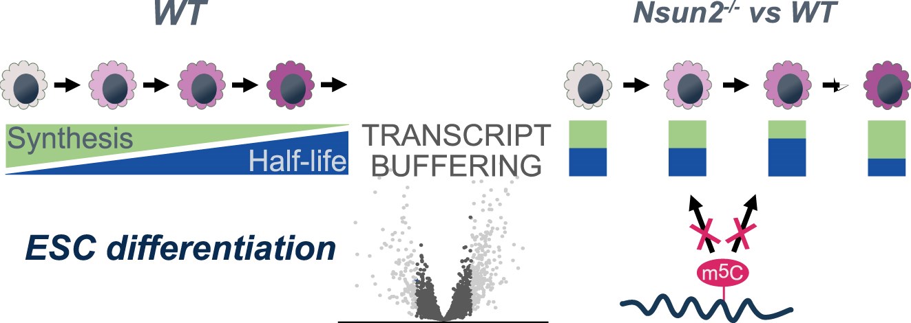 Während der Differenzierung ändern sich mRNA Synthese und Stabilität stark, doch ein robuster Puffermechanismus hält die Spiegel stabil. Der Verlust von Nsun2 verändert die mRNA Umsatzdynamik, ohne die absolute mRNA Menge zu beeinflussen. Dies geschieht unabhängig von m5C Modifikation der mRNA. (Grafik: Oxford University Press)