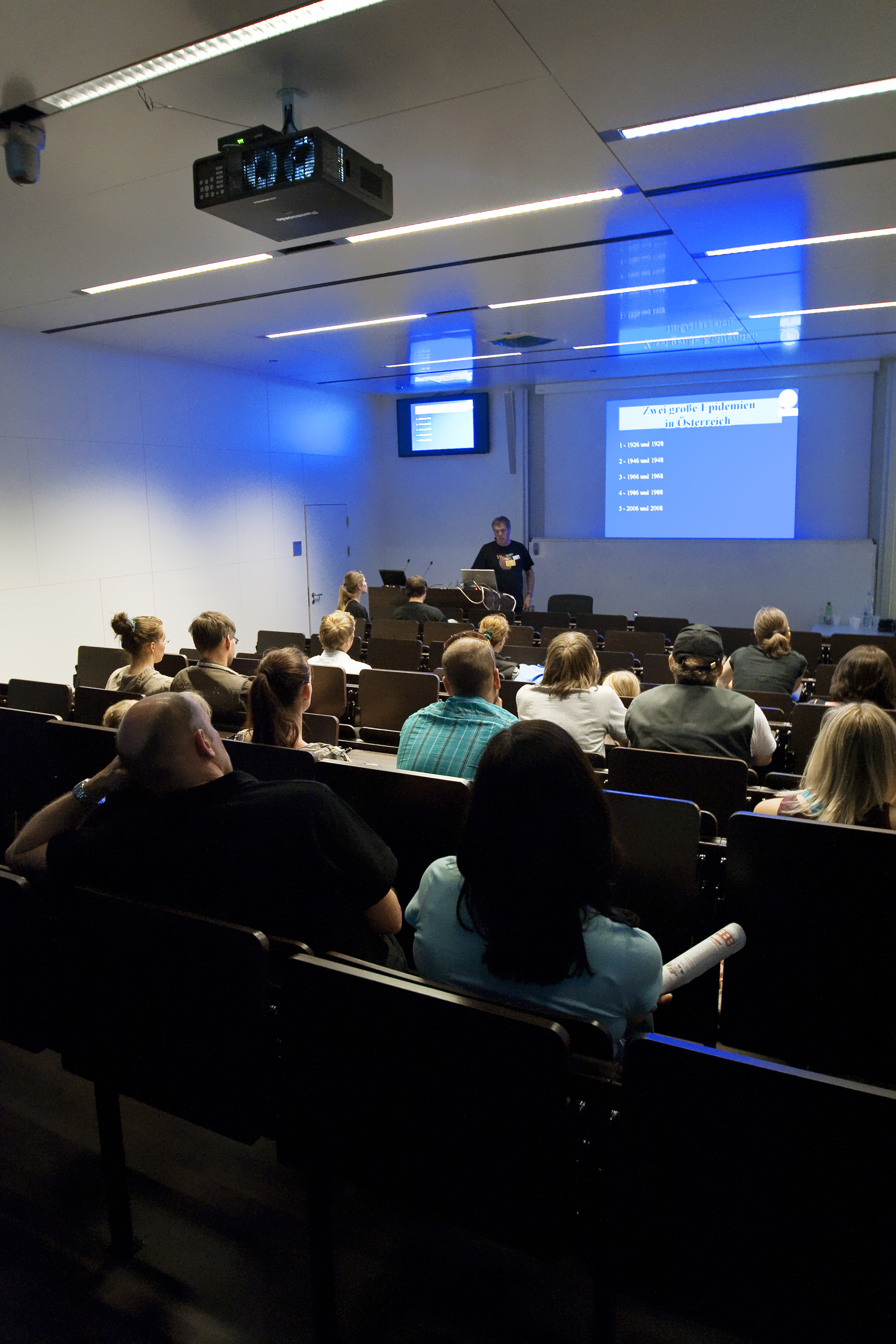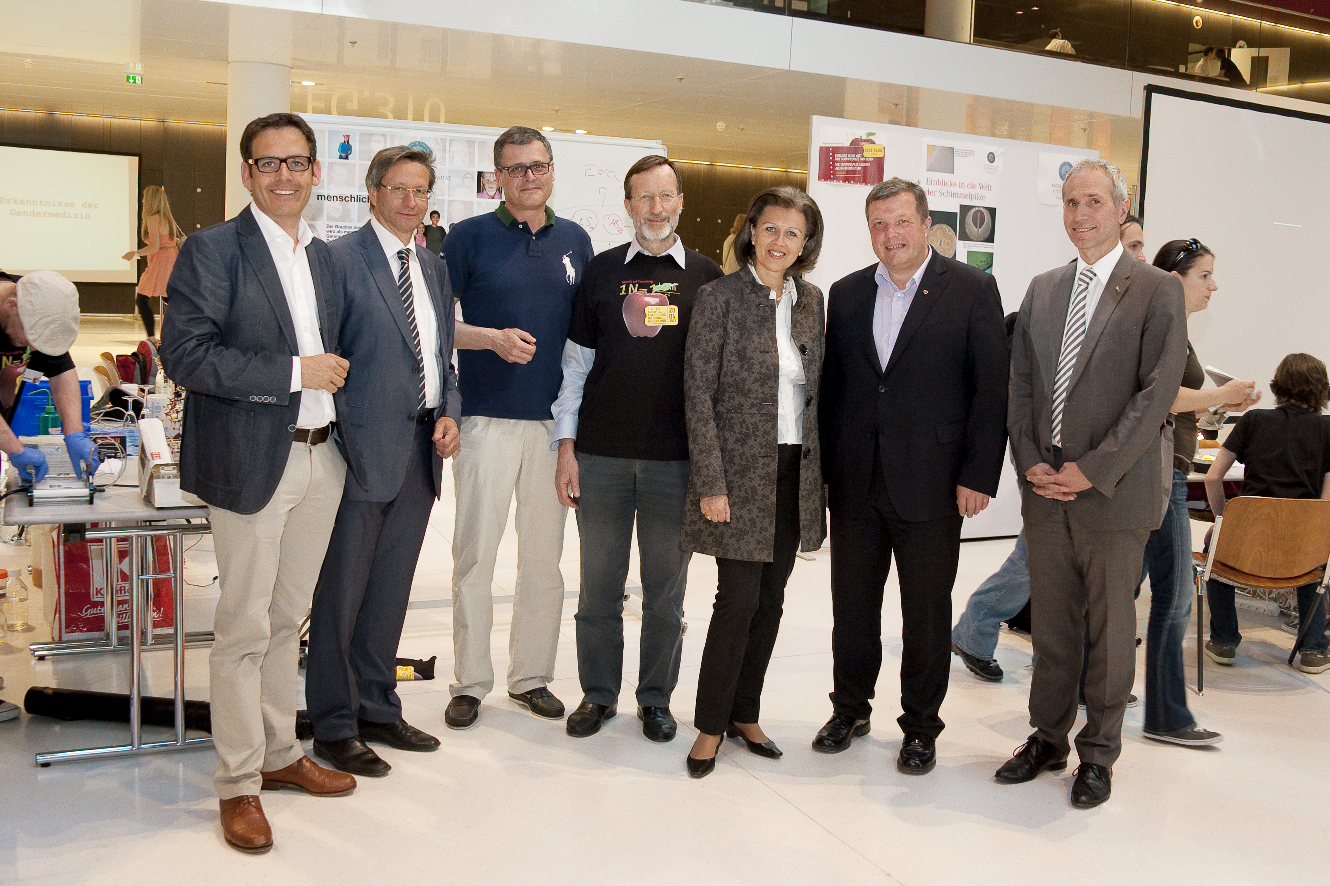 Mit insgesamt zehn Stationen im neuen Center für Chemie und Biomedizin (CCB) war die Medizinische Universität Innsbruck heuer vertreten. Die Innsbrucker HNO-Klinik stellte in der „Tiroler Forschungsnacht“ drei spannende Forschungsfelder vor. Unter dem Motto „High Fidelity im Kopf“ wurde beispielsweise eine echte Hörschnecke im Auflichtmikroskop, Modelle des Innenohres und modernste implantierbare Hörgeräte präsentiert. Die Sektion für Genomik und Rnomik beantwortete die Frage, ob man Gene essen kann. Die renommierte Mikrobiologin Prof.in Cornelia Lass-Flörl gab Einblicke in die Welt der Schimmelpilze. Dem interessanten Thema Zellteilung und Zelltod widmete sich ein Stand der Sektion für Entwicklungsimmunologie. Einblicke in die Welt der Moleküle gab Prof. Siegfried Schwarz, während die Sektion für Biologische Chemie die "Räumliche Gestalt von Proteinen" präsentierte. Auch aus dem Bereich Gesundheitsvorsorge wurde Interessantes vorgestellt: Ein interaktiver Vortrag von Prof. Reinhard Würzner verdeutlichte, warum keine medizinische Maßnahme so viele Leben rettet wie Impfungen. Der Kardiologe Otmar Pachinger zeigte in Filmen die Funktion des Herzens. Eine begehbare Arterie sowie eine „Herzdiagnosestraße“ des Frauengesundheitszentrums waren weitere Höhepunkte. Sehr begehrt waren auch wieder die Führungen durch das Anatomische Museum mit mehr als 5.000 Exponaten. Für diese Veranstaltung wurden im CCB Platzkarten ausgegeben.