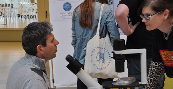 Im Rahmen der Langen Nacht der Forschung am 4. April 2014 präsentierte sich die Medizinische Universität an insgesamt 15 Stationen. Zahlreiche neugierige und wissbegierige BesucherInnen nutzten diese Angebote im Centrum für Chemie und Biochemie (CCB).