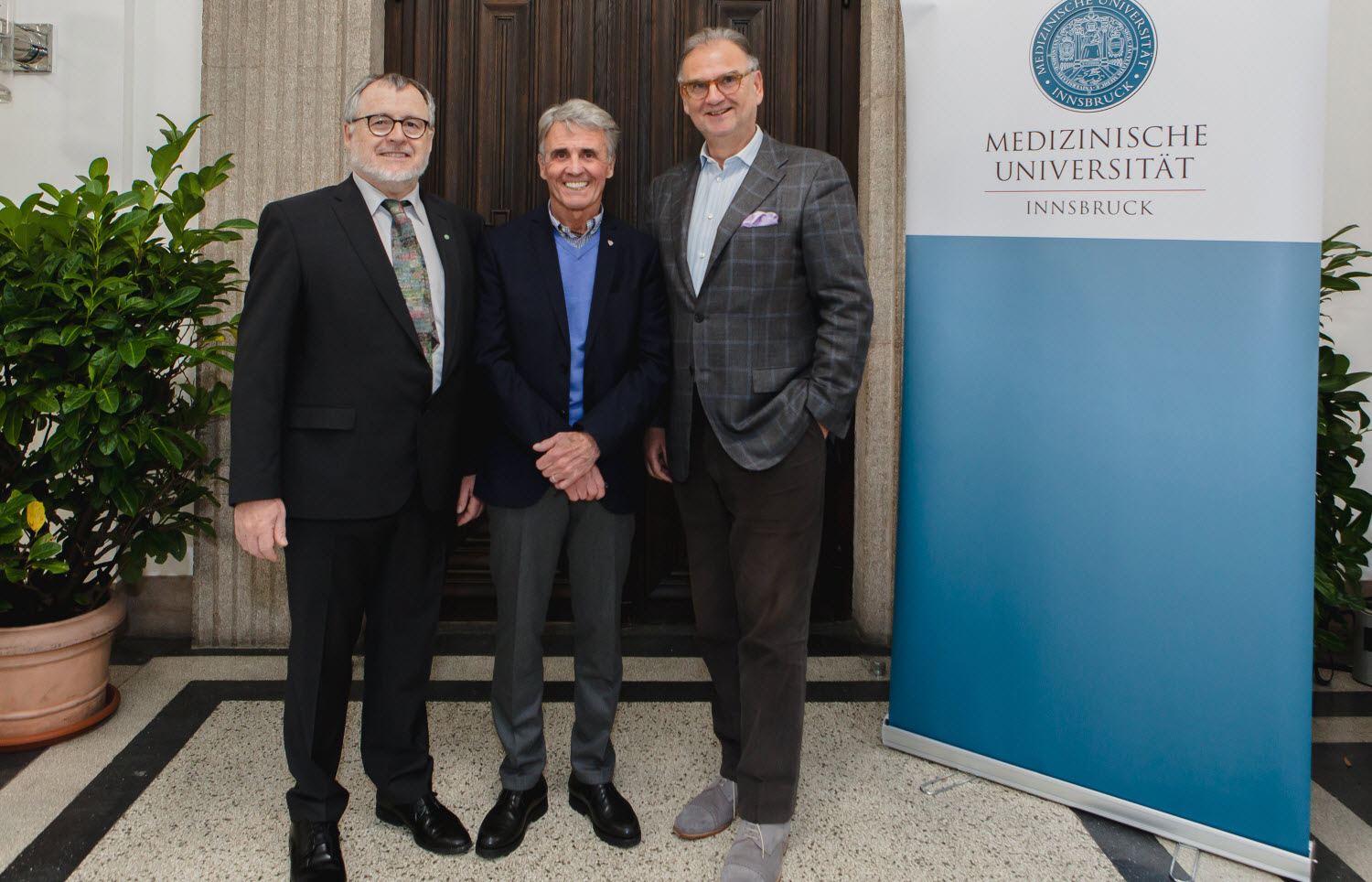 Rund 200 AbsolventInnen, Studierende, ÄrztInnen, WissenschafterInnen, Angehörige der Medizinischen Universität Innsbruck sowie Interessierte wollten am Dienstagsabend den Vortrag von Peter Habeler nicht versäumen. Der Tiroler Alpinist berichtete anschaulich von seinen Erfahrungen jenseits von 8.000 Metern, wie er scheinbar Unmögliches überwunden hat und wie das Verlassen der Komfortzone zum Erfolgsfaktor werden kann.