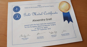 Erfolg bei Prüfungen und Abschlüssen scheint Alexandra Gratl gepachtet zu haben. Immerhin hat sie auch ihre deutsche Dissertation – das deutsche Doktorat absolvierte sie an der Charité in Berlin unter der Leitung von Andreas Greiner – mit Auszeichnung abgeschlossen. Beim Jahreskongress in Valencia war sie schließlich die einzige Kandidatin, die mehr als 90 Prozent der Punkte erreichte und somit mit Auszeichnung bestanden hat. Die dreiteilige Prüfung beinhaltete die Interpretation eines wissenschaftlichen Papers hinsichtlich Qualität und methodisch-statistischer Inhalte und Aussagekraft, die praktische Bewältigung dreier offen chirurgischer und einer endovaskulären Station sowie die Beurteilung von fünf klinischen Fallbeispielen. Auch die neue österreichische Facharztprüfung beinhaltet neben sieben Fallbeispielen die Interpretation eines wissenschaftlichen Papers und ist somit ebenso zum Teil wissenschaftlich ausgerichtet.