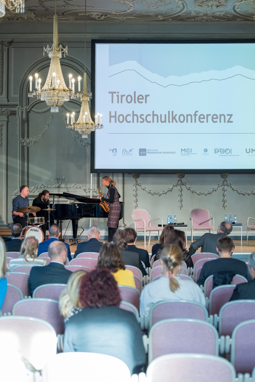 Das fürstliche Ambiente des Kaiser-Leopold-Saales, die musikalische Begleitung durch die Uni Jazz Combo und nicht zuletzt eine prominent und kompetent besetzte Diskussionsrunde am Podium machten den Tiroler Hochschulempfang auch in diesem Jahr zu einem besonderen Ereignis.