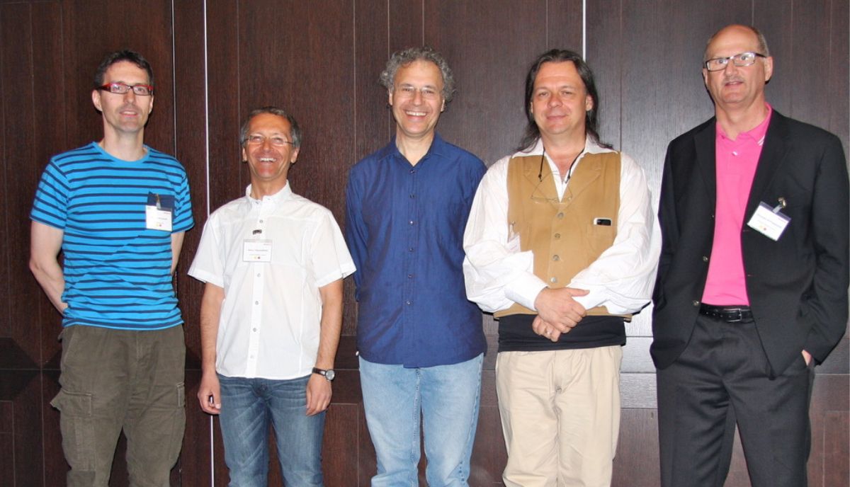 BU: Abschluss-Symposium Gen-Au 2012: (v.l.) Norbert Polacek, Universität Bern, Zlatko Trajanoski, Medizinische Universität Innsbruck, Victor Ambros, University of Massachusetts Medical School (USA), Burkhart Rost, TU München und Alexander Hüttenhofer, Medizinische Universität Innsbruck (Foto: Ludger Hengst)