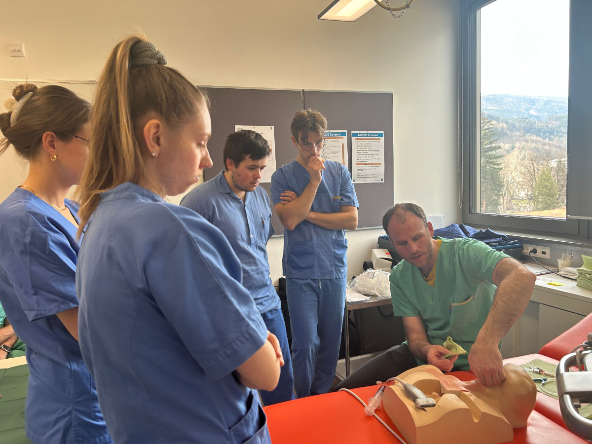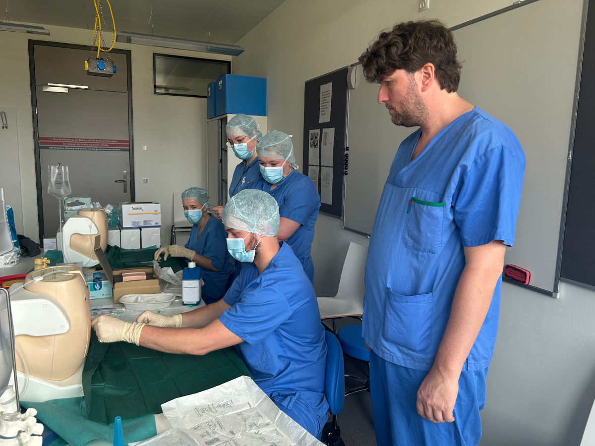 Benjamin Hetzer, ärztlicher Leiter des Skills Lab, übt mit den TeilnehmerInnen eine Lumbalpunktion.