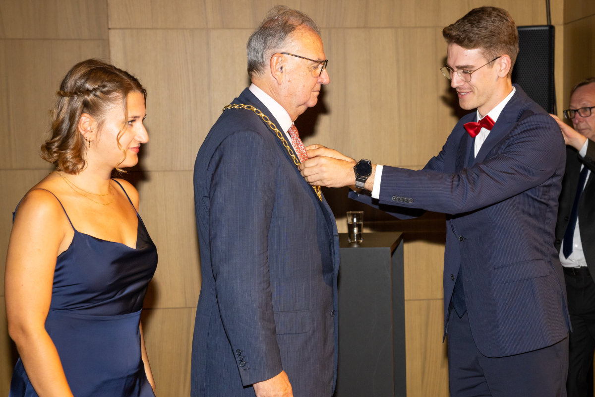 Zum Abschluss überreichte die ÖH symbolisch die „Altrektoren-Kette“, ehe Rektor Fleischhacker selbst das Wort ergriff, um über die letzten acht Jahre zu reflektieren und die Gäste zum abschließenden Beisammensein einzuladen.
