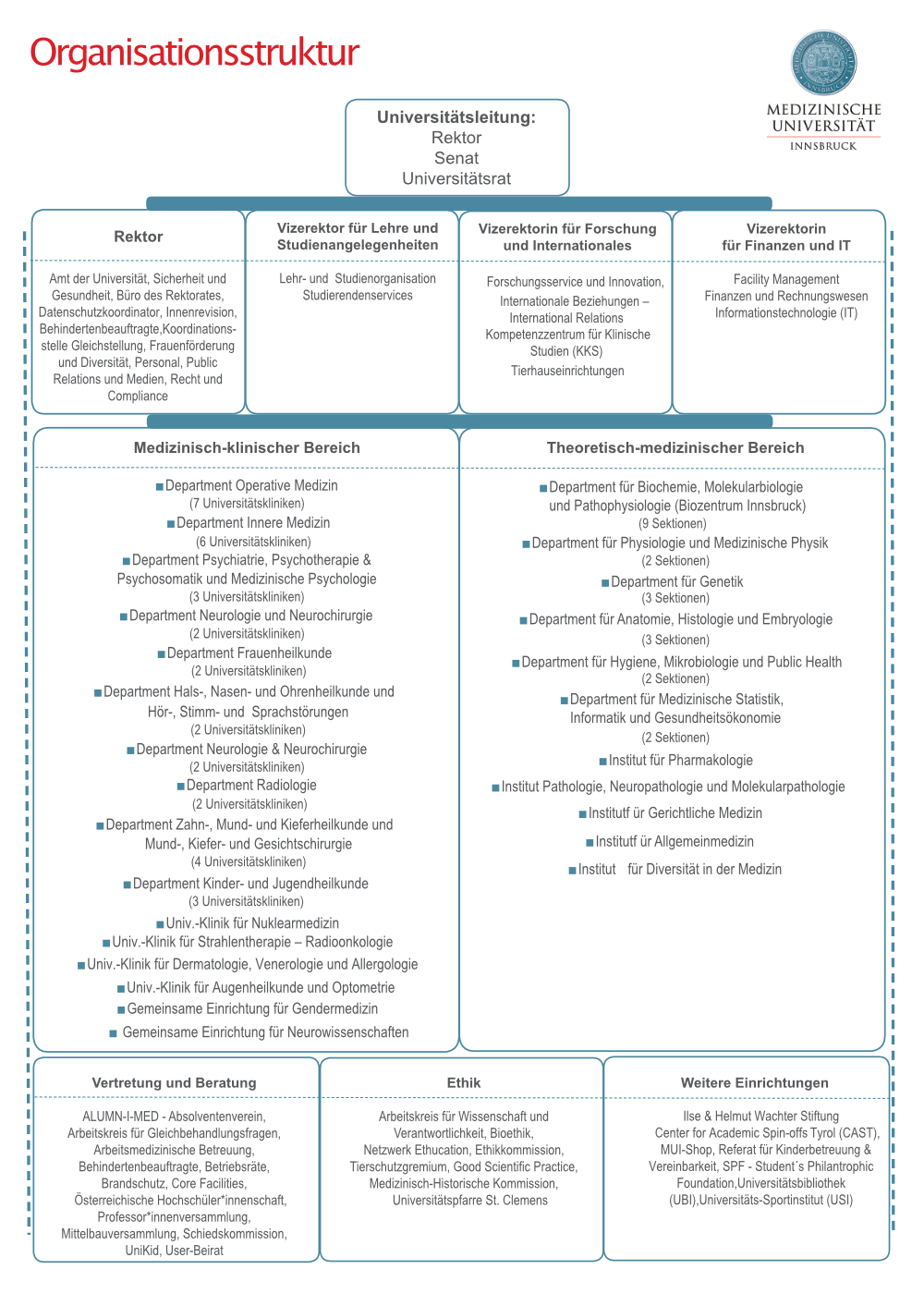 Das QM-System der Medizinischen Universität Innsbruck ist in den letzten zwei Jahrzehnten ständig gewachsen und orientiert sich an Teilen der gängigen QM-Modelle EFQM und ISO, wobei die Prozessoptimierung durch konsequente Anwendung des PDCA-Zyklus die grundlegende Basis des QM-Systems bildet und bei der Konzeptionierung und Entwicklung neuer Strategien, Studiengänge oder Prozesse bzw. bei deren Weiterentwicklung angewandt wird.